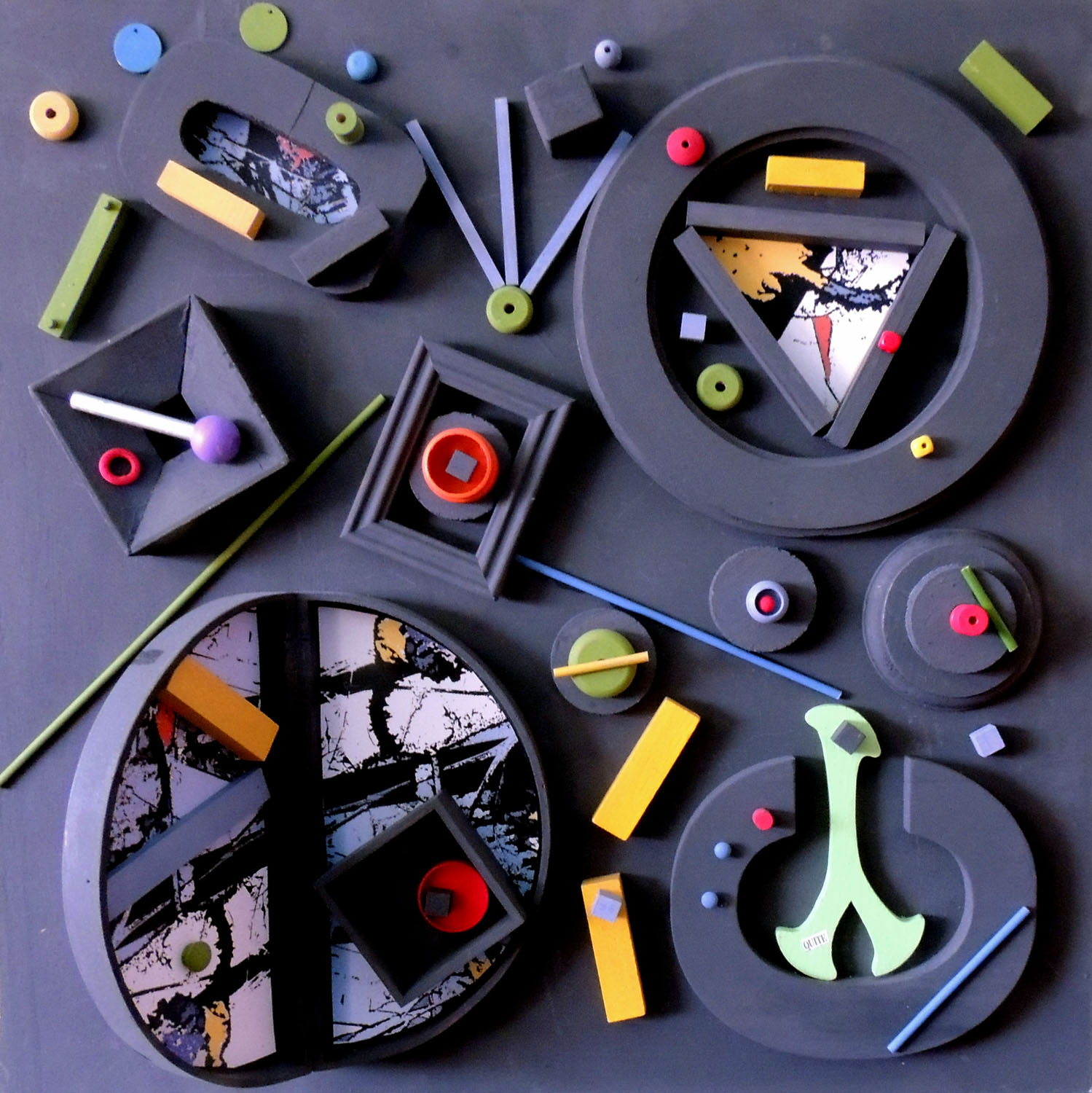A geometric spectacle done in shades of apple green, pink, and black. Created from wooden shapes found at yard sales and thrift stores. 24 x 24 inches.