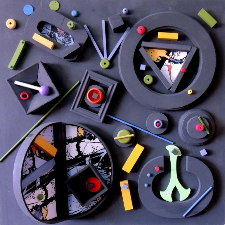 A wall hanging assemblage made from bits and bobs. A hinged box opens and closes.
