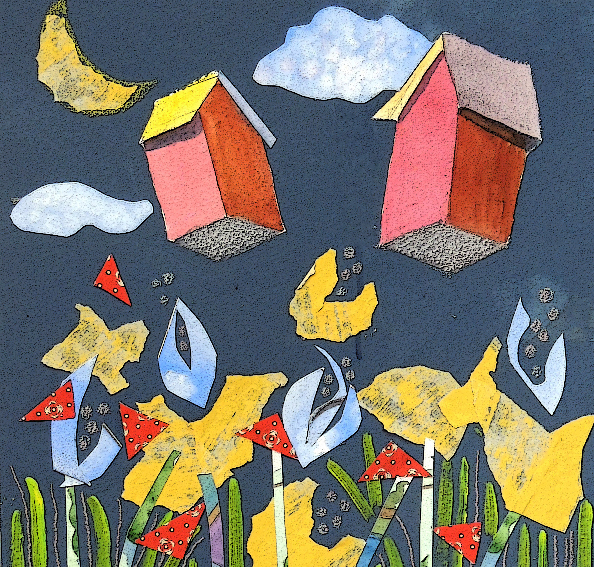 A collage on paper, 8 x 11 inches, Matted, but not framed. Mat size is 14 x 11 so should fit a standard frame.